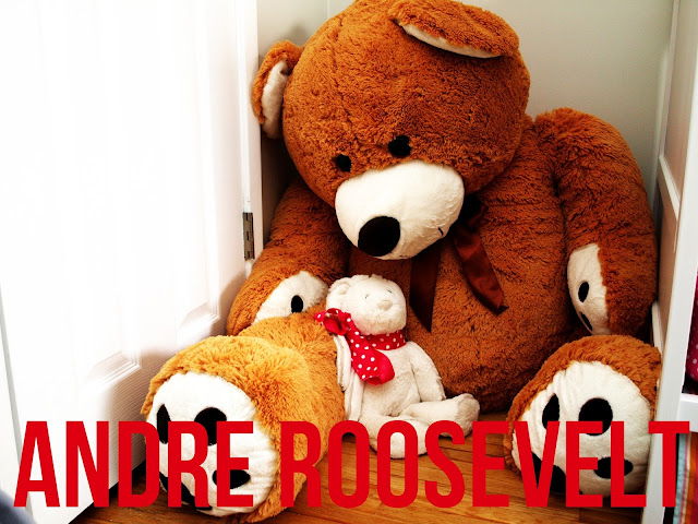 The name had to be big enough to reflect the bear's huge size. Who better to be named after than Andre the Giant? And this bear is the bear to end all bears so his last name is very fitting. Teddy bears were first called such after Teddy Roosevelt refused to kill a bear cub, thus this bear has taken on his last name. The first teddy to the last.